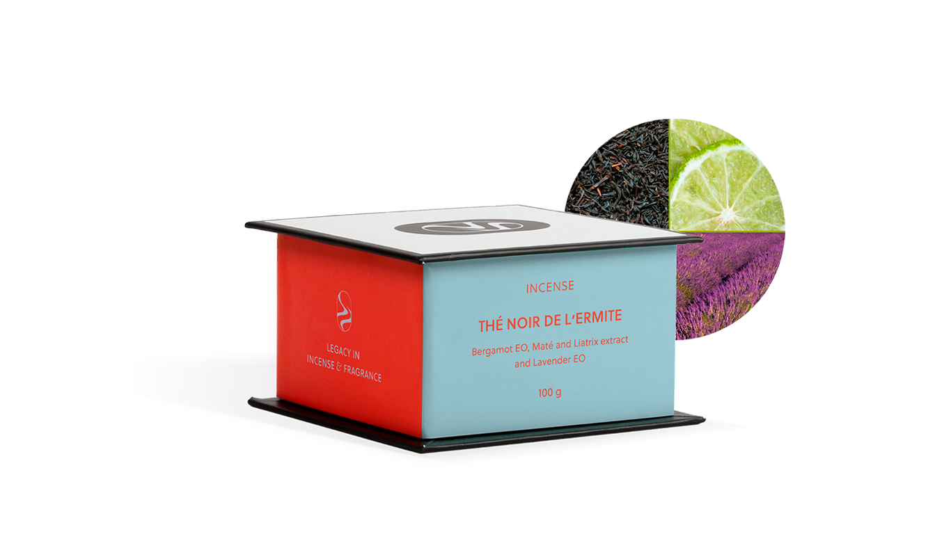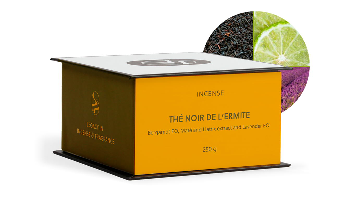 Van een wandeling in de herfstschemering door het kreupelhout van onze bossen, brengt deze wierook het oorspronkelijke idee mee van een compositie die de ontmoeting schetst tussen klassieke thee en de lichte, pittige geur van net geplukte Bergamot Calabria, die zijn fragiele, levendige en sensuele aroma’s neerlegt met de gratie van prachtige legendes. Lavendel, etherisch en teder, met zijn satijnachtige accenten, brengt de zachte, suave charme van zijn bloemen in nog met dauw bedekte aren en gestreeld door de zon naar dit boeket van geurige zwarte thee met muskusachtige vleugjes.